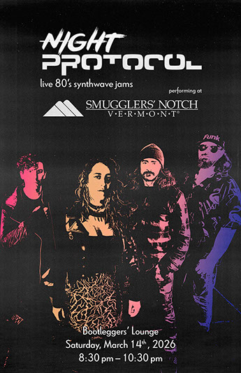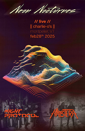 A website designed for Vermont-based live electronic synthwave band Night Protocol, featuring interactive video backdrops and links to media content.